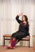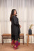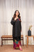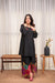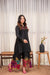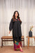This black crepe two-piece is adorned with vibrant floral prints, enhanced by hand-painted golden outlines for a luxurious touch. Effortlessly chic and breathable, perfect for a statement look.