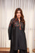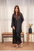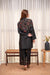 A sleek black crepe ensemble adorned with delicate floral print, offering a graceful blend of elegance and comfort. This timeless 2-piece set is perfect for effortless sophistication