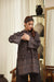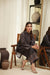 A black crepe two-piece adorned with intricate geometric patterns and elegant button detailing. Effortlessly stylish and breathable, perfect for a bold yet graceful look.